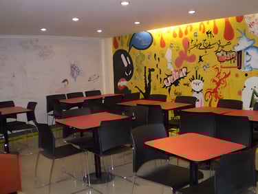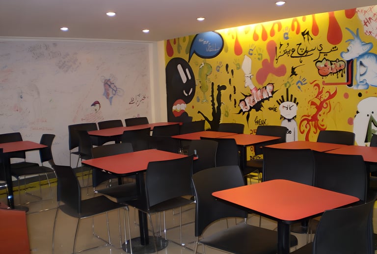 The Offload Lounge is a vibrant, cafeteria-style café designed for a tech company, offering employees a joyful escape from daily pressures. Bright hues of yellow, red, and orange energize the space, while warm lighting enhances playful wall art and modern communal seating. A special "vent wall" invites team members to express their emotions after tough customer calls, creating a supportive, relaxed environment where creativity and well-being thrive in perfect harmony.