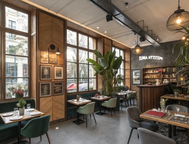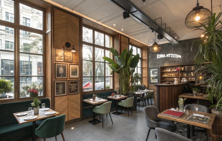 Salon de Bleu evokes the spirit of timeless elegance and intellectual charm. Bathed in natural light from grand wooden-framed windows, the café’s interior harmonizes rustic warmth with refined modernity. A poetic focal wall bearing the word “Romanticism” anchors the space in classical beauty. With sculptural lighting, rich textures, and thoughtful craftsmanship, this design creates a setting where architecture and ambiance compose a quiet ode to sophistication and soulful gathering